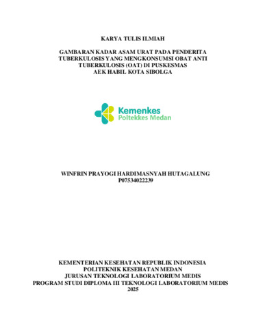 Hutagalung, Winfrin Prayogi Hardimansyah (2025) GAMBARAN KADAR ASAM URAT PADA PENDERITA TUBERKULOSIS YANG MENGKONSUMSI OBAT ANTI TUBERKULOSIS (OAT) DI PUSKESMAS AEK HABIL KOTA SIBOLGA. Diploma thesis, Poltekkes Medan.