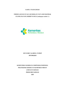 Turnip, Devi Esri Valerina (2025) FORMULASI DAN EVALUASI SEDIAAN PASTA GIGI EKSTRAK ETANOL BATANG SEREH WANGI (Cymbopogon nardus L.). Diploma thesis, Poltekkes Kemenkes Medan.