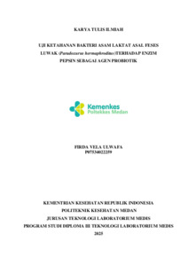 Firda Vela, Ulwafa (2025) UJI KETAHANAN BAKTERI ASAM LAKTAT ASAL FESES LUWAK (Paradoxurus hermaphroditus)TERHADAP ENZIM PEPSIN SEBAGAI AGEN PROBIOTIK. Diploma thesis, Poltekkes Medan.