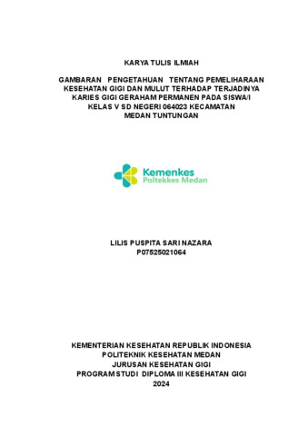 Nazara, Lilis Puspita Sari (2024) Gambaran Pengetahuan Tentang Pemeliharaan Kesehatan Gigi Dan Mulut Terhadap Terjadinya Karies Gigi Geraham Permanen Pada Siswa/I Kelas V SD Negeri 064023 Kecamatan Medan Tuntungan. Diploma thesis, Poltekkes Kemenkes Medan.
