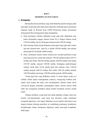 Kesimpulan dan saran: Terapi pijat kaki efektif dalam menurunkan tekanan darah pada penderita hipertensi. Disarankan penerapan terapi pijat dapat dilakukan secara rutin oleh pasien hipertensi sebagai terapi non-farmakologis pendukung dalam menurunkan tekanan darah.