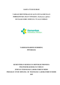 Sembiring, Tarishah Hardini (2025) VARIASI IDENTIFIKASI KUALITATIF KANDUNGAN FORMALIN PADA IKAN TONGKOL (Euthynnus affinis) DI PASAR SORE SIMPANG TUASAN MEDAN. Diploma thesis, Poltekkes Kemenkes Medan.