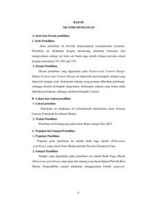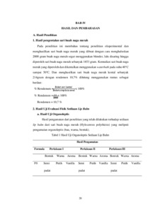 Metode penelitian ini dilakukan dengan metode eksperimental dengan rancangan percobaan dilakukan empat sediaan dengan tiga kali pengulangan setiap sediaan. Pada evaluasi sediaan pada lip balm dengan konsentrasi 5%, 10% dan 15% meliputi uji organoleptis, uji homogenitas, uji pH, uji daya oles, uji iritasi, uji stabilitas dan uji hedonik (kesukaan).