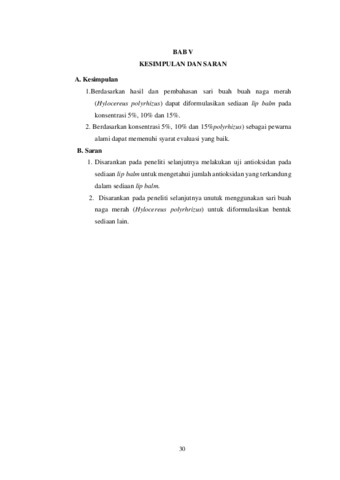 Kesimpulan penelitian ini adalah sari buah naga merah (Hylocereus polyrhizus) dapat diformulasikan sediaan lip balm yang baik dan stabil, pada konsentrasi 5%,10% dan 15% dapat meemenuhi syarat evaluasi yang baik.