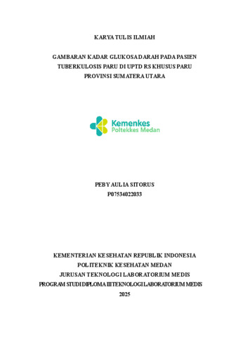 Sitorus, Peby Aulia (2025) GAMBARAN KADAR GLUKOSA DARAH PADA PASIEN TUBERKULOSIS PARU DI UPTD RS KHUSUS PARU PROVINSI SUMATERA UTARA. Diploma thesis, Poltekkes Kemenkes Medan.
