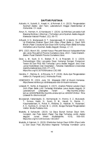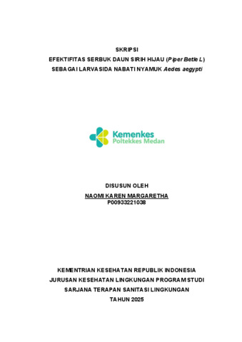 MARGARETHA, NAOMI KAREN (2025) EFEKTIFITAS SERBUK DAUN SIRIH HIJAU (Piper Betle L) SEBAGAI LARVASIDA NABATI NYAMUK Aedes aegypti. Diploma thesis, Poltekkes Kemenkes Medan.