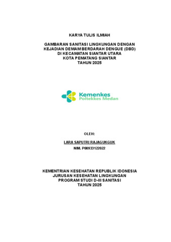 RAJAGUKGUK, LARA SAPUTRI (2025) GAMBARAN SANITASI LINGKUNGAN DENGAN KEJADIAN DEMAM BERDARAH DENGUE (DBD) DI KECAMATAN SIANTAR UTARA KOTA PEMATANG SIANTAR TAHUN 2025. Diploma thesis, Poltekkes Kemenkes Medan.