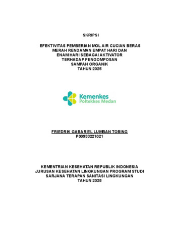 TOBING, FRIEDRIK GABARIEL LUMBAN (2025) EFEKTIVITAS PEMBERIAN MOL AIR CUCIAN BERAS MERAH RENDAMAN EMPAT HARI DAN ENAM HARI SEBAGAI AKTIVATOR TERHADAP PENGOMPOSAN SAMPAH ORGANIK TAHUN 2025. Diploma thesis, Poltekkes Kemenkes Medan.