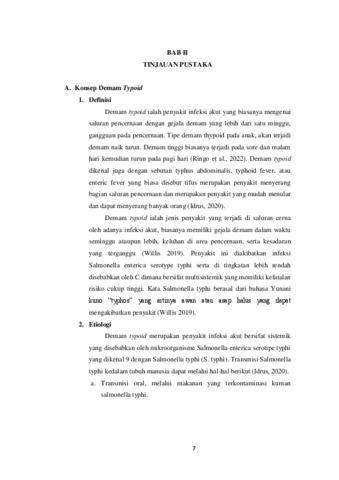 Latar belakang : demam typoid merupakan demam yang di akibatkan proses infeksi akut pada usus kecil yang disebabkan oleh bakteri salmonella typhi dengan masa inkubasi antara 6 hingga 14 hari dengan gejala kenaikan suhu tubuh di atas normal (37,5°C). Salah satu penerapan non farmakologis untuk menurunkan suhu tubuh yaitu tepid water sponge. Tepid water sponge merupakan sebuah teknik kompres hangat yang menggabungkan teknik kompres blok pada pembuluh darah supervisial dengan teknik seka. Tindakan ini dilakukan dengan cara mengompres anak dengan air hangat di bagian tubuh seperti dahi, leher, kedua aksila, lipatan paha kemudian diusapkan keseluruh tubuh.
