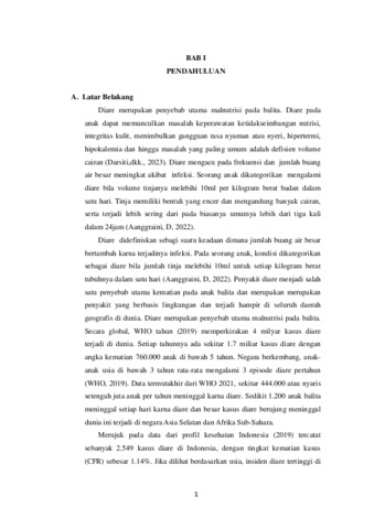 Latar belakang: diare adalah suatu kondisi yang ditandai dengan frekuensi dan konsistensi tinja yang tidak normal. Biasanya ditandai dengan tinja yang lebih encer, seringkali berair, dan seringkali disertai dengan frekuensi buang air besar yang meningkat sebanyak > 3 kali per hari. Terapi non farmakologi yang dapat dilakukan untuk mengatasi masalah diare pada anak adalah dengan pemberian oralit selama 3 hari berturut turut.