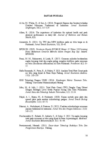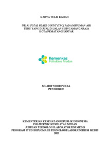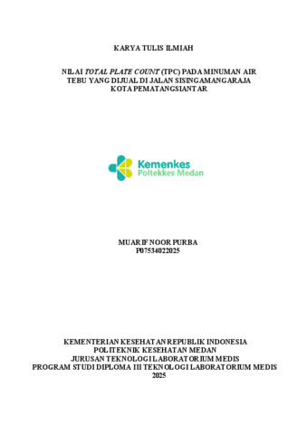 Purba, Muarif Noor (2025) NILAI TOTAL PLATE COUNT (TPC) PADA MINUMAN AIR TEBU YANG DIJUAL DI JALAN SISINGAMANGARAJA KOTA PEMATANGSIANTAR. Diploma thesis, Poltekkes Kemenkes Medan.
