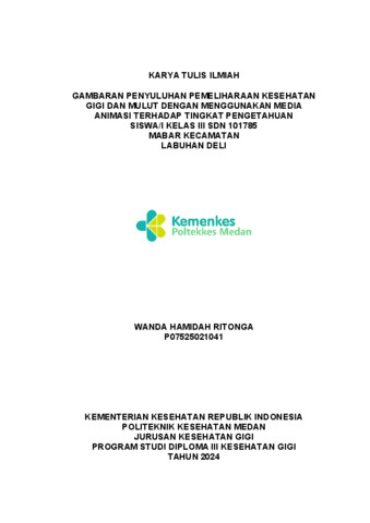 Ritonga, Wanda Hamidah (2024) Gambaran Penyuluhan Pemeliharaan Kesehatan Gigi Dan Mulut Dengan Media Animasi Terhadap Tingkat Pengetahuan Siswa/I Kelas III SDN 101785 Mabar Kecamatan Labuhan Deli. Diploma thesis, Poltekkes Kemenkes Medan.