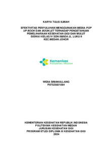 Simanullang, Widia (2024) Efektivitas Penyuluhan Menggunakan Media Pop Up Book Dan Booklet Terhadap Pengetahuan Pemeliharaan Kesehatan Gigi Dan Mulut Siswa/I Kelas IV SDN 060934 Jl. Luku II Kec. Medan Johor. Diploma thesis, Poltekkes Kemenkes Medan.