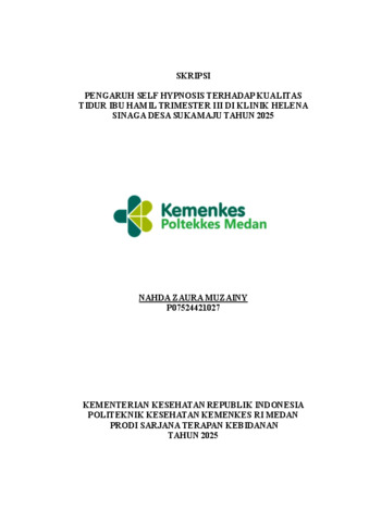 Muzainy, Nahda Zaura (2025) Pengaruh Self Hypnosis Terhadap Kualitas Tidur Ibu Hamil Trimerter III di Klinik Helena Sinaga Desa Sukamaju. Diploma thesis, Poltekkes Kemenkes Medan.