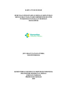 PURBA, JOY GRACE NATALIA (2025) HUBUNGAN PENGETAHUAN DENGAN KEPATUHAN MINUM OBAT PADA PASIEN HIPERTENSI DI UPTD PUSKESMAS PANGKALAN BUDIMAN SEI RAMPAH. Diploma thesis, Poltekkes Kemenkes Medan.