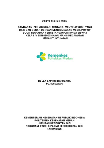 Batubara, Bella Sapitri (2025) Gambaran Penyuluhan Tentang Menyikat Gigi Yang Baik Dan Benar Dengan Menggunakan Media Pop Up Book Terhadap Pengetahuan Gigi Pada Siswa/i Kelas IV SDN 068003 Kayu Manis Kecamatan Medan Tuntungan. Diploma thesis, Poltekkes Kemenkes Medan.
