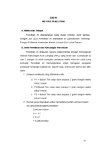 Metode Penelitian: Penelitian dilakukan di Laboratorium Teknologi Pangan Jurusan Gizi Lubuk Pakam pada bulan Mei 2025. Jenis penelitian adalah eksperimen dengan Rancangan Acak Lengkap (RAL) yang terdiri dari 3 perlakuan yaitu perlakuan A (waktu infus 2 menit), Perlakuan B (waktu infus 4 menit ), dan Perlakuan C (waktu infus 6 menit) dengan 2 kali pengulangan .