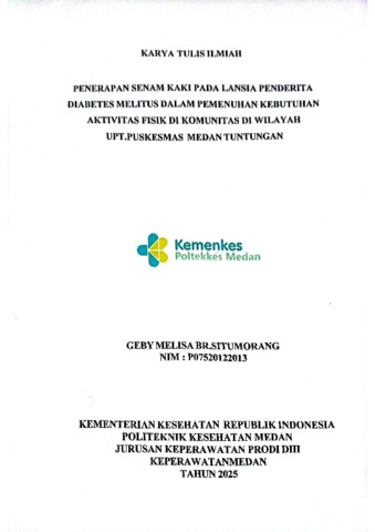 Situmorang, Geby Melisa Br (2025) Penerapan Senam Kaki Pada Lansia Penderita Diabetes Melitus Dalam Pemenuhan Keutuhan Aktifitas Fisik Di Komunitas Di Wilayah UPT Puskesmas Medan Tuntungan. Diploma thesis, Poltekkes Kemnkes Medan.
