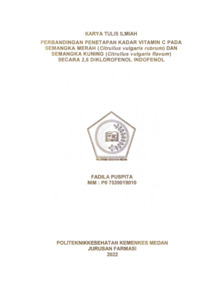 FADILA PUSPITA, FADILA PUSPITA (2022) PERBANDINGAN PENETAPAN KADAR VITAMIN C PADA SEMANGKA MERAH (Citrullus vulgaris rubrum) DAN SEMANGKA KUNING (Citrullus vulgaris flavum) SECARA 2,6 DIKLOROFENOL INDOFENOL. Diploma thesis, Poltekkes Kemenkes Medan.