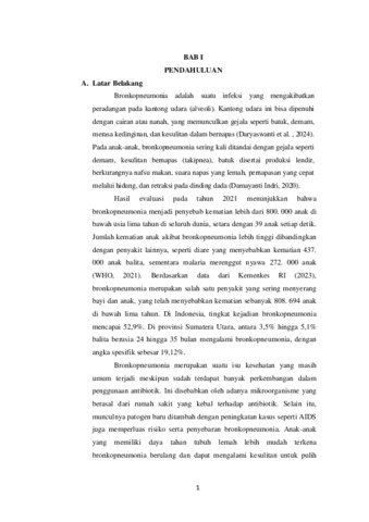 Latar Belakang : Bronkopneumonia merupakan infeksi yang menyebabkan peradangan pada kantung udara (alveoli) kantung udara menimbulkan gejala seperti batuk, demam, menggigil dan kesulitan bernapas. Peradangan pada parenkim paru yang meluas sampai bronkioli yang menyebabkan peradangan yang terjadi pada jaringan paru dengan cara penyebaran langsung melalui pernafasan sampai ke bronkus, yang menimbulkan gejala umum yaitu seperti hidung tersumbat disertai keluarnya sekret dari hidung, sakit tenggorokan dan rasa tidak nyaman saat menelan, bersin, dan juga batuk kering. Bersihan jalan nafas tidak efektif adalah ketidakmampuan membersihkan sekret atau obstruksi jalan nafas untuk mempertahankan jalan nafas tetap paten. Penatalaksanaan Non farmakologis dengan mengajarkan teknik nafas dalam dan batuk efektif, yang merupakan suatu metode batuk dengan benar.