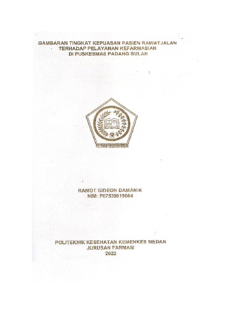 Damanik, Ramot Gideon Damanik (2022) GAMBARAN TIMGKAT KEPUASAN PASIEN RAWAT JALAN TERHADAP PELAYANAN KEFARMASIAN DI PUSKESMAS PADANG BULAN. Diploma thesis, Poltekkes Kemenkes Medan.
