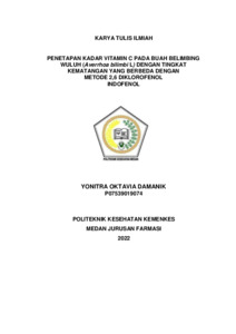 DAMANIK, YONITRA OKTAVIA DAMANIK (2022) PENETAPAN KADAR VITAMIN C PADA BUAH BELIMBING WULUH (Averrhoa bilimbi L) DENGAN TINGKAT KEMATANGAN YANG BERBEDA DENGAN METODE 2,6 DIKLOROFENOL INDOFENOL. Diploma thesis, Poltekkes Kemenkes Medan.