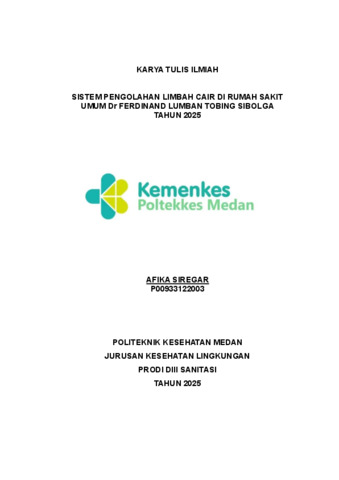 SIREGAR, AFIKA (2025) SISTEM PENGOLAHAN LIMBAH CAIR DI RUMAH SAKIT UMUM Dr. FERDINAND LUMBAN TOBING SIBOLGA TAHUN 2025. Diploma thesis, Poltekkes Kemenkes Medan.
