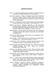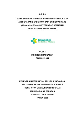 HABEAHAN, MORINDAH (2025) Uji Efektivitas Granula Berbentuk Serbuk Dan Air Perasan Berbentuk Cair Dari Buah Pare (Momordica Charantia) Terhadap Kematian Larva Nyamuk Aedes Aegypti. Diploma thesis, Poltekkes Kemenkes Medan.