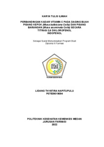NAPITUPULU, LIDANG THYATIRA NAPITUPULU (2022) PERBANDINGAN KADAR VITAMIN C PADA DAGING BUAH PISANG KEPOK (Musa balbisiana Colla) DAN PISANG BARANGAN (Musa acuminata Colla.) SECARA TITRASI 2,6 DIKLOROFENOL INDOFENOL. Diploma thesis, Poltekkes Kemenkes Medan.