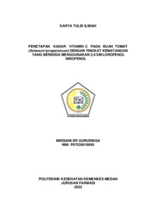 BR GURUSINGA, MEISIANI BR GURUSINGA (2022) PENETAPAN KADAR VITAMIN C PADA BUAH TOMAT (Solanum lycopersicum) DENGAN TINGKAT KEMATANGAN YANG BERBEDA MENGGUNAKAN 2,6 DIKLOROFENOL INDOFENOL. Diploma thesis, Poltekkes Kemenkes Medan.