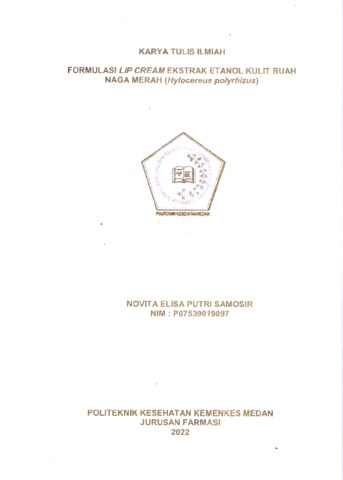 Samosir, Novita Elisa Putri Samosir (2022) FORMULASI LIP CREAM EKSTRAK ETANOL KULIT BUAH NAGA MERAH (Hylocereus polyrhizus). Diploma thesis, Poltekkes Kemenkes Medan.