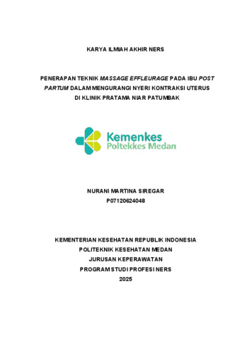 Siregar, Nurani Martina (2025) Penerapan Teknik Massage Effleurage Pada Ibu Post Partum Dalam Mengurangi Nyeri Kontraksi Uterus Di Klinik Pratama Niar Patumbak. Diploma thesis, Poltekkes Kemnkes Medan.