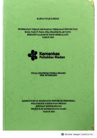 Sinamo, Yulia ChaterinePrimsa (2025) PENERAPAN TERAPI MEWARNAI TERHADAP PENURUNAN RASA TAKUT PADA USIA PRASEKOLAH YANG DIHOSPITALISASI DI RSUD SIDIKALANG TAHUN 2025. Diploma thesis, POLTEKKES KEMENKES MEDAN.