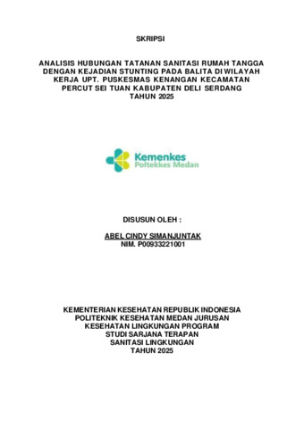 SIMANJUNTAK, ABEL CINDY (2025) ANALISIS HUBUNGAN TATANAN SANITASI RUMAH TANGGA DENGAN KEJADIAN STUNTING PADA BALITA DI WILAYAH KERJA UPT. PUSKESMAS KENANGAN KECAMATAN PERCUT SEI TUAN KABUPATEN DELI SERDANG. Diploma thesis, Poltekkes Kemenkes Medan.