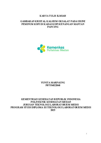 Marpaung, Yunita (2025) GAMBARAN KRISTAL KALSIUM OKSALAT PADA URINE PEMINUM KOPI DI KADAI KOPI KENANGAN MANTAN PANCING. Diploma thesis, Poltekkes Kemenkes Medan.