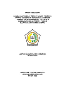 Nasution, Alifiya Nabila Pratiwi (2023) Gambaran Tingkat Pengetahuan Tentang Karang Gigi Dengan Menggunakan Metode Ceramah Pada Siswa/I Kelas V SD Negeri 060886 Jalan Rebab Pasar II Padang Bulan Kecamatan Medan Baru. Diploma thesis, Poltekkes Kemenkes Medan.