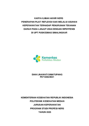 Simatupang, Dian Linawati (2025) Penerapan Pijat Refleksi Kaki Melalui Asuhan Keperawatan Terhadap Penurunan Tekanan Darah Pada Lanjut Usia Dengan Hipertensi Di Upt Puskesmas Simalingkar. Diploma thesis, Poltekkes Kemnkes Medan.