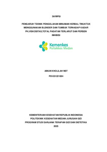NST, AINUN KHOLILAH (2025) PENGARUH TEKNIK PENGOLAHAN MINUMAN HERBAL TINUKTUK MENGGUNAKAN BLENDER DAN TUMBUK TERHADAP KADAR PH,VISKOSITAS,TOTAL PADATAN TERLARUT DAN PERSEN INHIBISI. Diploma thesis, Poltekkes Kemenkes Medan.