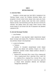 Penelitian ini bersifat eksperimental dengan menggunakan rancangan acak lengkap (RAL) dengan 2 perlakuan yaitu MT1 (blender) dan MT2 (tumbuk). Pengujian metode pH meter untuk mengetahui kadar pH nya, metode viscometer untuk mengetahui viskositasnya, metode refractometer untuk mengetahui total padatan terlarutnya, dan metode DPPH untuk mengetahui persen inhibisinya.