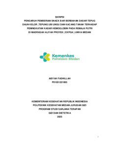 FADHILLAH, AISYAH (2025) PENGARUH PEMBERIAN SNACK BAR BERBAHAN DASAR TEPUG DAUN KELOR ,TEPUNG UBI UNGU DAN KACANG TANAH TERHADAP PENINGKATAN KADAR HEMOGLOBIN PADA REMAJA PUTRI DI MADRASAH ALIYAH PROYEK ( EXPGA ) UNIVA MEDAN. Diploma thesis, Poltekkes Kemenkes Medan.