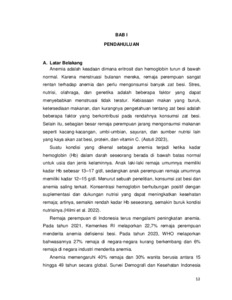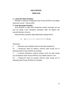 Penelitian ini menggunakan desain kuasi eksperimen dengan rancangan one group pretest-posttest. Subjek penelitian adalah remaja putri yang diberikan intervensi berupa snack bar selama 21 hari. Data dikumpulkan melalui pengukuran hemoglobin sebelum dan sesudah pemberian dengan menggunakan metode digital test, serta pengukuran asupan energi , protein dan zat besi dengan metode food recal 24 jam.