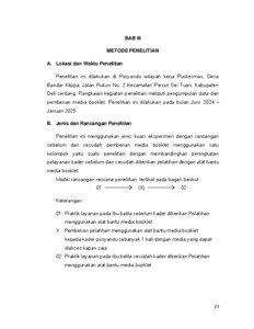 booklet terhadap praktik layanan kader. Temuan ini memperlihatkan bahwa pelatihan kader dengan penggunaan media booklet yang informatif dan mudah diakses mampu meningkatkan pemahaman dan keterampilan kader dalam memberikan layanan di Posyandu. Disarankan pelatihan rutin dan penggunaan media edukatif seperti booklet untuk meningkatkan kualitas pelayanan Posyandu.