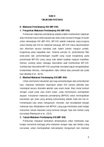 Latar Belakang : Makanan Pendamping Air Susu Ibu (MP-ASI) adalah makanan atau minuman yang diberikan kepada bayi yang berusia lebih dari 6 bulan, hal ini dikarenakan ASI hanya mampu memenuhi duapertiga kebutuhan bayi 6-9 bulan dan pada usia 9-12 bulan memenuhi setengah kebutuhan bayi. Akibat kurangnya asupan gizi pada periode ini yaitu terjadinya malnutrisi kronis/Stunting.