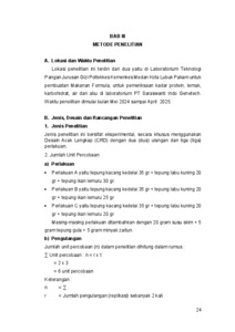 Metode : Penelitian ini menggunakan Rancangan Acak Lengkap (RAL) dengan 3 perlakuan. Subjek penelitian sebanyak 60 panelis tidak terlatih untuk uji daya terima yang meliputi penilian warna, tekstur, rasa dan aroma. Perolehan data uji daya terima diolah menggunakan uji kruskall Wallis. Penentuan kadar proksimat meliputi kadar air, kadar abu, kadar protein, dan kadar lemak.