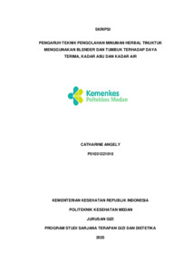 ANGELY, CATHARINE (2025) PENGARUH TEKNIK PENGOLAHAN MINUMAN HERBAL TINUKTUK MENGGUNAKAN BLENDER DAN TUMBUK TERHADAP DAYA TERIMA, KADAR ABU DAN KADAR AIR. Diploma thesis, Poltekkes Kemenkes Medan.