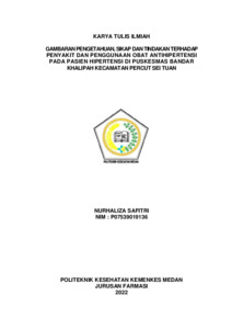 NURHALIZA SAFITRI, NURHALIZA SAFITRI (2022) GAMBARAN PENGETAHUAN, SIKAP DAN TINDAKAN TERHADAP PENYAKIT DAN PENGGUNAAN OBAT ANTIHIPERTENSI PADA PASIEN HIPERTENSI DI PUSKESMAS BANDAR KHALIPAH KECAMATAN PERCUT SEI TUAN. Diploma thesis, Poltekkes Kemenkes Medan.