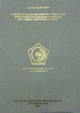 LUBIS, SYAFRINA TRI ANGGI LUBIS (2022) UJI EFEKTIVITAS ANTIINFLAMASI EKSTRAK ETANOL DAUN SAMBILOTO (Andrographys paniculata) PADA MENCIT JANTAN (Mus musculus). Diploma thesis, Poltekkes Kemenkes Medan.