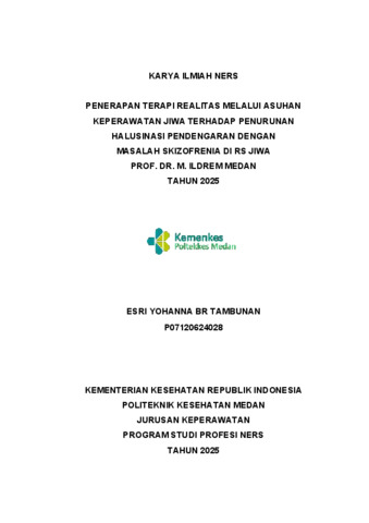 Tambunan, Esri Yohanna Br. (2025) Penerapan Terapi Realitas Melalui Asuhan Keperawatan Jiwa Terhadap Penurunan Halusinasi Pendengaran Dengan Masalah Skizofrenia Di Rs Jiwa Prof. Dr. M. Ildrem Medan Tahun 2025. Diploma thesis, Poltekkes Kemenkes Medan.