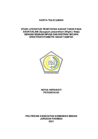 NOVIA HERAWATI, NOVIA HERAWATI (2021) STUDI LITERATUR PENETAPAN KADAR TANIN PADA DAUN SALAM (Syzygium polyanthum (Wight.) Walp) DENGAN SEDIAAN INFUSA DAN EKSTRAK SECARA SPEKTROFOTOMETRI SINAR TAMPAK. Diploma thesis, Poltekkes Kemenkes Medan.