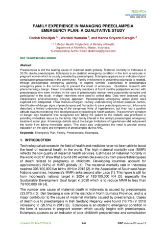 Khodijah, Dodoh and Wardati, Humaira and Saragih, Hanna Sriyanti (2023) FAMILY EXPERIENCE IN MANAGING PREECLAMPSIA EMERGENCY PLAN: A QUALITATIVE STUDY. Community practitioner, 20 (12). pp. 548-557. ISSN 1462 2815